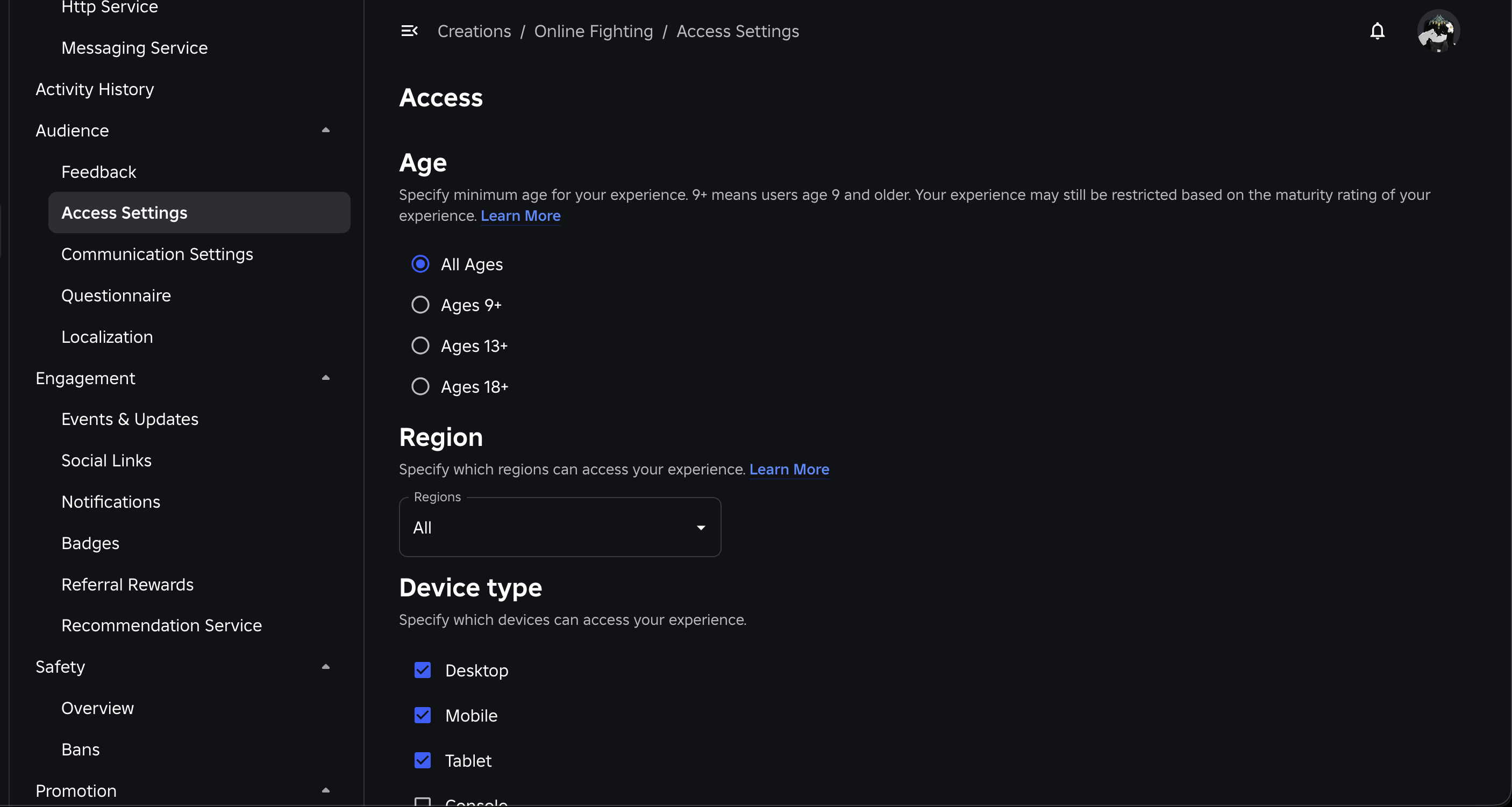 May I see the Experience Settings?