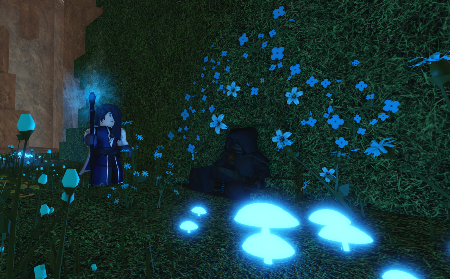 No, stupid. If you look at the plants, it’s obvious the blue stuff is growing out of the corpse. The character just sprouted up from there.