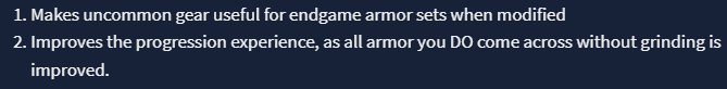- Makes uncommon gear useful for endgame armor sets when modified