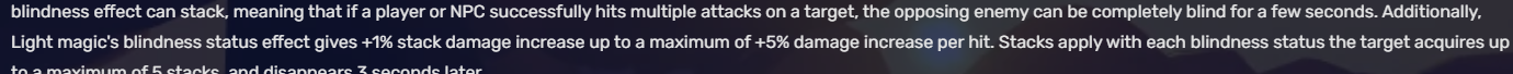 While light can cause end-less streams of screen blindness, even if it doesnât have any synergize itâs also the fastest magic, giving it the best way to launch easy barrages of max-blindness and damage increases. This is also easier with barrages of light-snare. You can barely hit anything while under the blinding effect, making the attempts of even trying to synergize effects harder