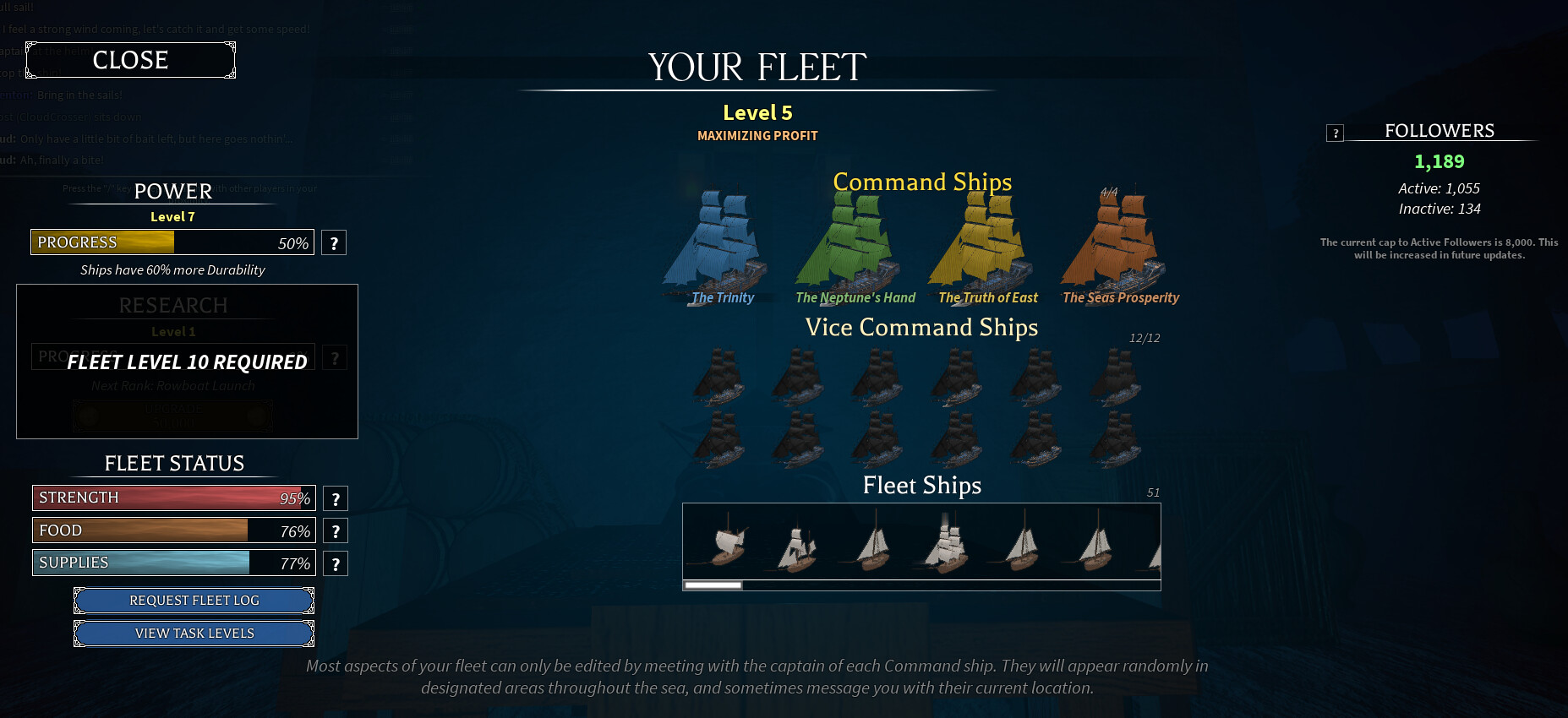 Feel free to pause the fleet if the percentage drops too low, It’s completely safe now and your fleet captains will still randomly change islands so you can change tasks.