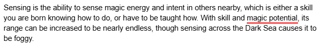 And I know all classes will be able to sense and not just mage-related classes, but it still follows that magic energy can be used to sense other magic energy. Plus berserker and warrior will probably sense through “trace magic energy,” oracle is the only one that probably won’t use any magic energy related power at all for sensing