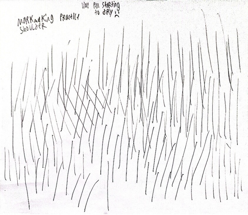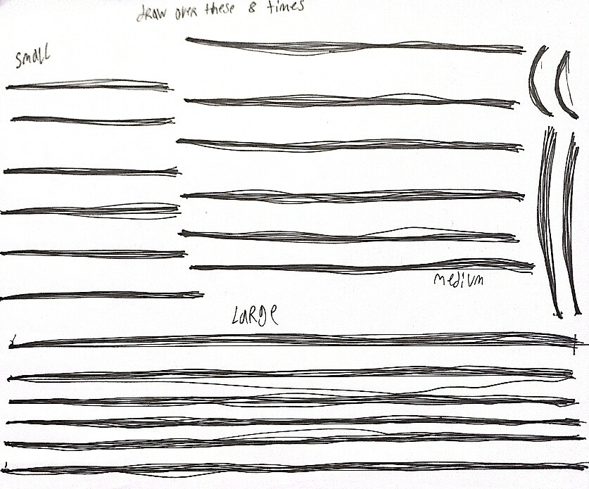 And below is my assignment. I was told to draw 8 lines over 1 line and to avoid fraying, I also did it with my shoulder to get the hang of things.