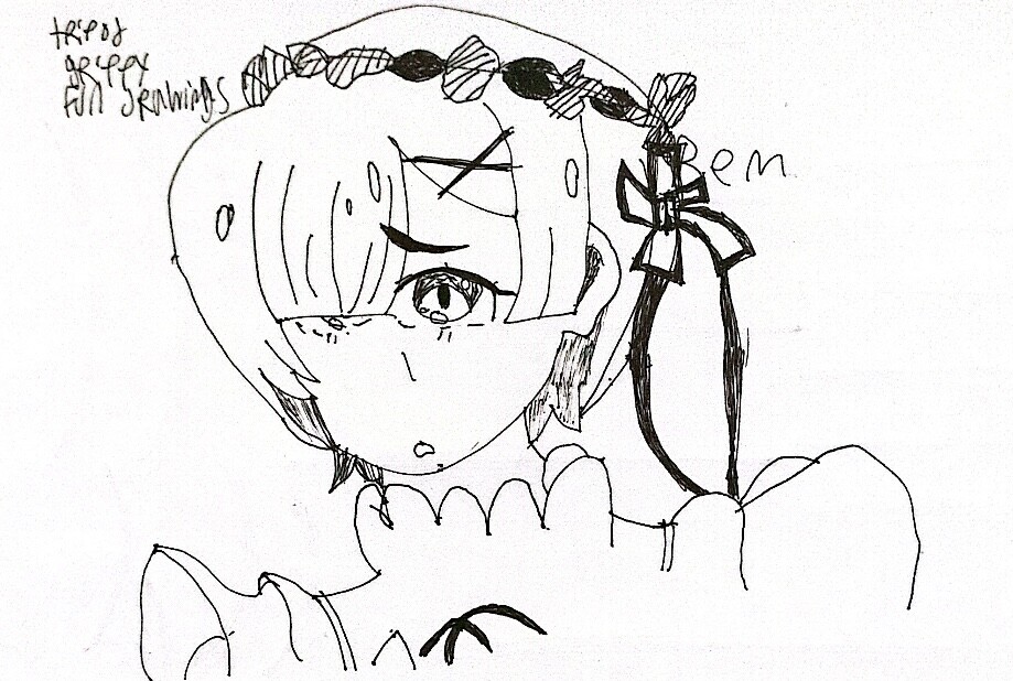 I drew Rem. While doing so I practiced my shoulder and tripod grip style of drawing. I also put lines on her headband thingy to indicate a different texture, which came out really nice and was truly an ingenius move on my part