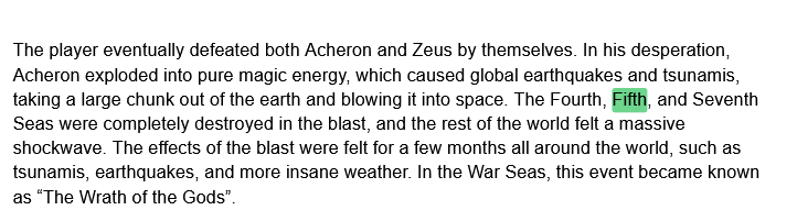 Valencia is almost certainly dead, even though she is in the same tier of strength as Acheron and Theos, she was most likely completely unprepared for an attack that vaporized the entire sea she was in. Also the seas in the Seven Seas aren’t as linear in nature as the War Seas, therefore the Fifth Sea isn’t actually 2 seas removed from the Seventh Sea. Here’s a rough map of the Seven Seas Vetex made in like 2018 that shows the Fifth Sea directly bordering the Seventh with only a great rift separating them: