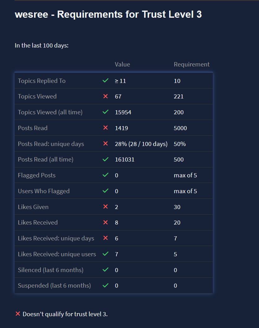 TL3 is added/removed automatically by the system, so it’ll take some time of activity to regain it. Here’s how your stats are currently compared to the reqs: