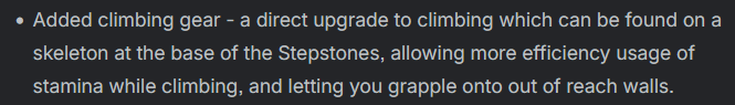 kinda hope they put a reminder for people to grab climbing gear when update comes out since its right at the stepstones (unless you just simply unlock it automatically after completing that story part then thats awesome but no ones confirmed it )
