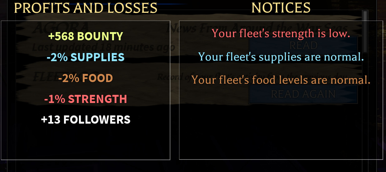 but with maximising risk i gain more profits which i can also use to resupply/repair my fleet and still have some left for my own while the food and supplies lost rate hasnt changed much since i still have it set on task plunder recover recover