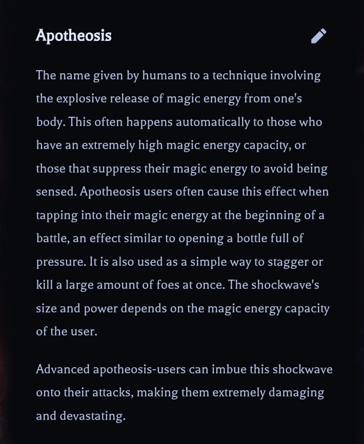 It was in the book of athena somewhere. unless i’m misremembering, it said it was an explosive release of magic energy that stuns and knocks back foes and those who master it can imbue apotheosis in their attacks.