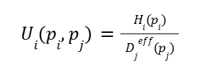 A player’s payoff is defined as their relative survivability, measured by hits to kill. Given player i with health Hi facing opponent j dealing effective damage Djeff, the payoff is