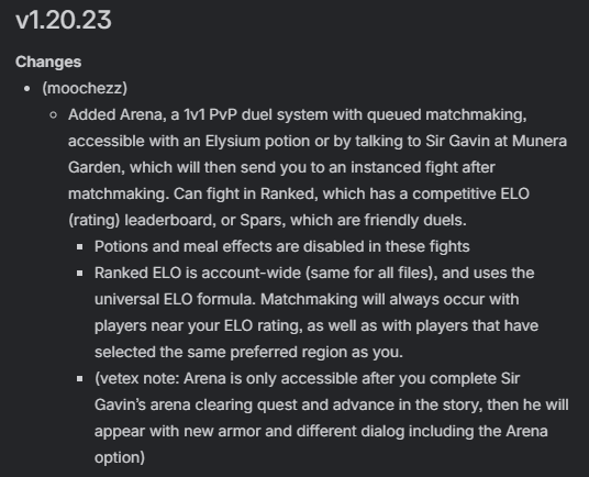 I hope we won’t be limited by our wealth in this arena. Having access to every piece of high-level gear in the game, or having gamemodes that allow for preset armorsets/no armor at all would be nice. The main issue with PVP is how gear trumps skill, after all, and circumventing that might make it more convienent for new players to ease into the scene.