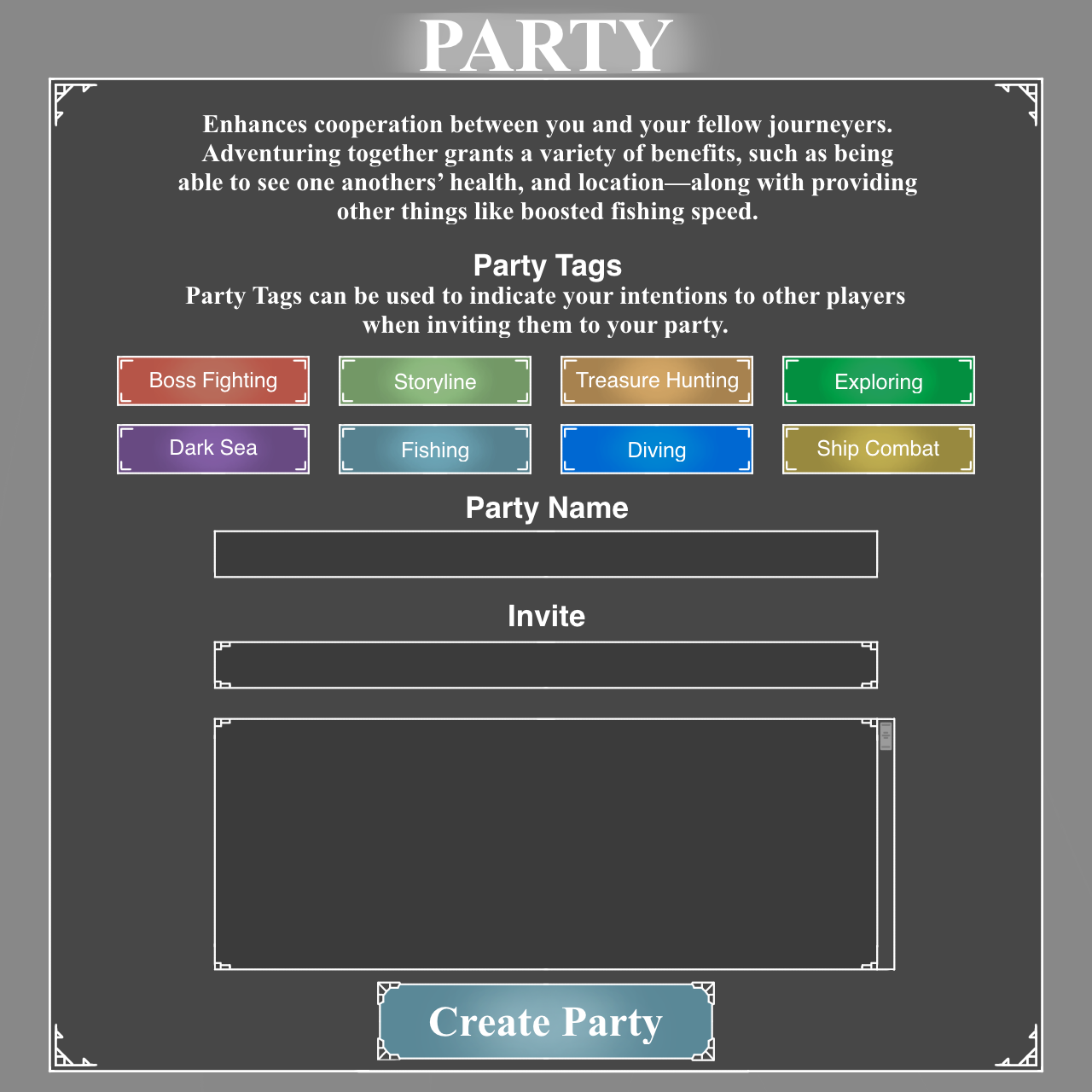 Party Tags would be a fairly simple system: when creating a Party, you can now select a tag which will be included with the invitation, specifying what you want to do. Additionally, if you’ve created a Party with said tag, it will display above your character to other players, indicating that you wish to do said activities with others’ help.