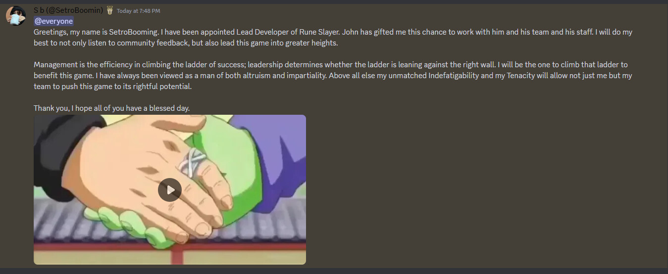 Ok. I can only prey that John (Owner) still actually owns the game and gets final say on updates (since whenever a and update was posted he would revert it and listen to the community. Setro might replace or remove current testers, and a lot of testers don’t trust him. There were a few new devs that people do trust though.