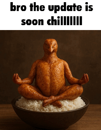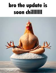 Someone post that image of the chicken meditating with the "chill update is soon"
