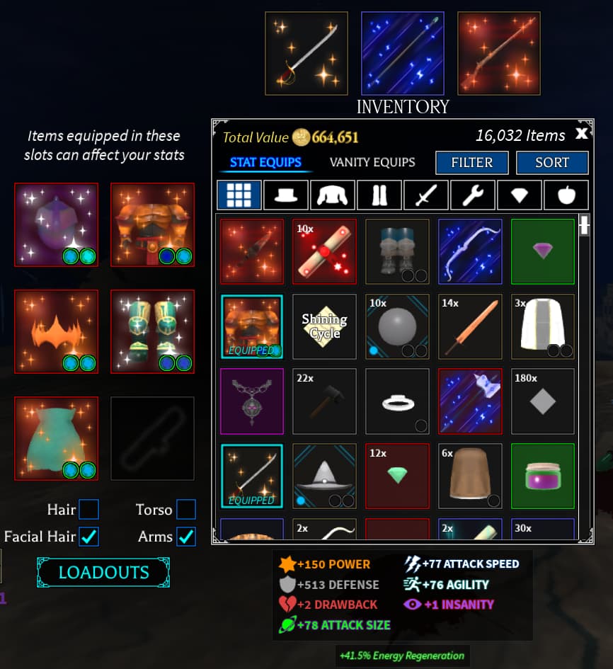 warrior, ardent atl rapier, bursting atl cutlass, and tempered plunders (the plunders get swapped out a lot)
