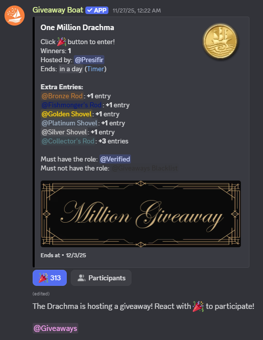 Unrelated to Drachma December, there is currently an ongoing giveaway of 1Mil galleons/drachma!