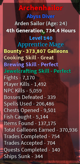 The legacy of your arcane odyssey file… What badges and titles has it achieved? What challenges has it completed… How many bosses or enemies it has defeated… What clan was it a part of and how much impact did they have on the environment… List anything you did on your file that you deem notable or big for us to discuss or something